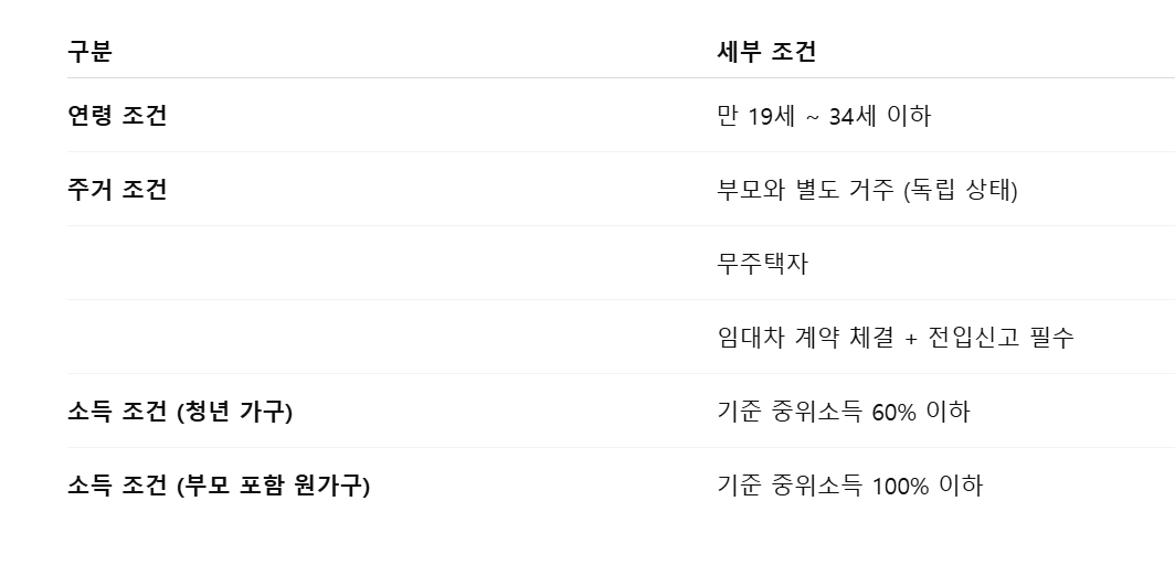 지원 대상은 단순히 "청년"이라고 해서 모두 가능한 것이 아니라, 연령 + 주거 + 소득 조건을 모두 충족해야 합니다.